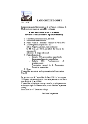 assemblée ordinaire le mercredi 22 avril 2026 à 19.00 heures au Centre communautaire de la paroisse de Marly